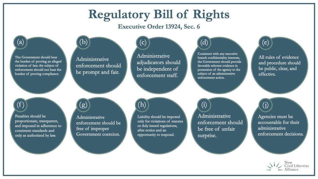 Over the summer I wrote about Executive Order 13924, which attempts to lessen the administrative burdens faced by private individuals and businesses by reining in the administrative state. In addition to directing agencies to rescind, modify, or waive regulations that may hamper economic recovery from the COVID-19 pandemic, section 6 of the Order also acknowledged important principles of fairness in administrative dealings. As I noted in June, many of the principles outlined in section 6 strongly echoed NCLA’s March comments to the Office of Management and Budget (OMB).
